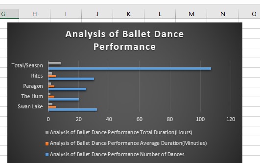 The performance of the five groups performed in 107 dances overall is portrayed in the above table. The duration of their performances in hours is also provided which requires various durations for those performances. The average duration of the performance is also provided in this analysis.